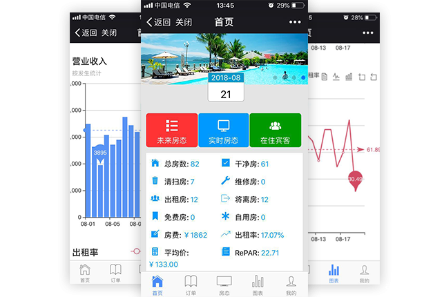 直观的掌握酒店实时房态、总房数、干净房、清扫房、维修房、出租房、将离房、免费房、自用房